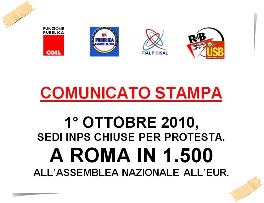 1 OTTOBRE 2010, SEDI INPS CHIUSE PER PROTESTA. A ROMA IN 1.500 ALL'ASSEMBLEA NAZIONALE ALL'EUR.
