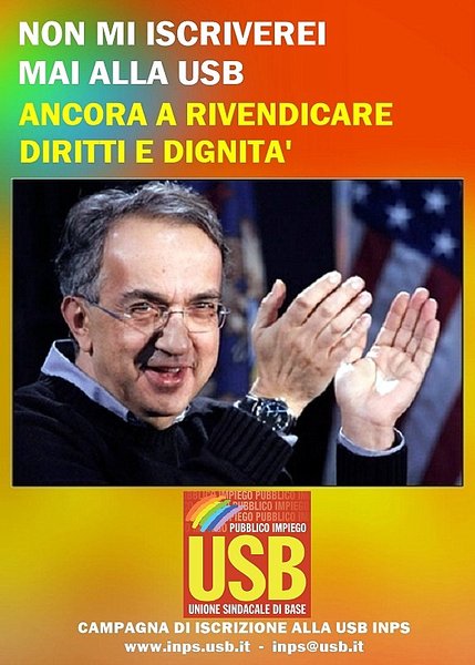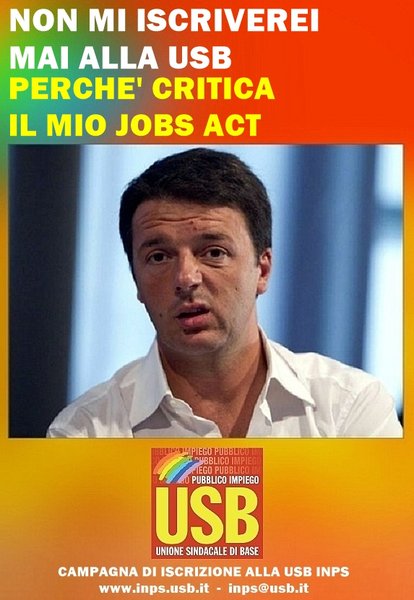 Vi proponiamo di essere protagonisti con noi di questa campagna straordinaria di iscrizioni. Da oggi pubblicheremo delle locandine con volti della politica, dell'economia e del sindacato, che dichiarano la loro indisponibilità ad iscriversi alla USB, spiegandone il perché. E' un gioco, che tuttavia serve anche a riflettere rispetto al contesto nel quale siamo chiamati ad agire.