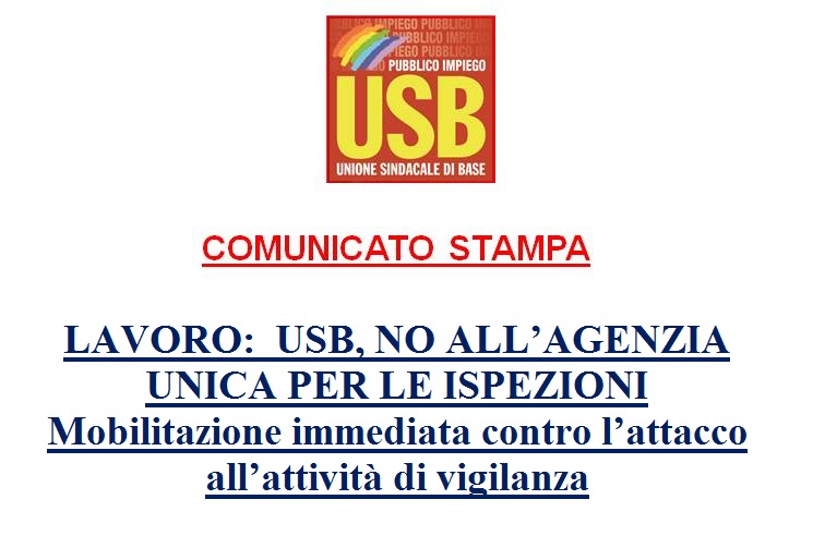 COMUNICATO STAMPA - LAVORO: USB, NO ALL'AGENZIA UNICA PER LE ISPEZIONI. Mobilitazione immediata contro l'attacco all'attività di vigilanza