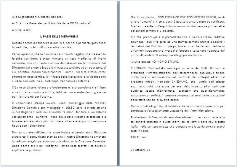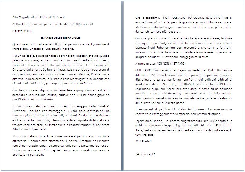 CHIEDIAMO l’immediato reintegro in sede del Dott. Romano e diffidiamo l’Amministrazione dall’intraprendere qualunque azione disciplinare o sanzionatoria nei confronti dei colleghi addetti al prodotto indebiti. Non solo, CHIEDIAMO, che i vertici dell’Istituto esprimano pubbliche scuse per aver dato in pasto ad un’opinione pubblica spesso disinformata, lavoratori che quotidianamente assicurano con serietà, impegno e competenza i servizi e le prestazioni dello stato sociale di questo paese.