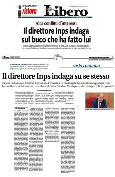 Dopo “il Fatto Quotidiano” anche “Libero Quotidiano” si occupa del conflitto d’interessi in capo all’attuale Direttore generale dell’INPS, Massimo Angelo Cioffi.