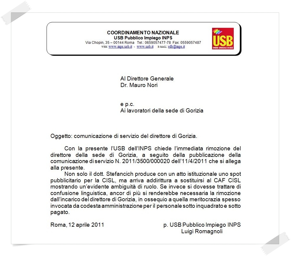 Con la presente l’USB dell’INPS chiede l’immediata rimozione del direttore della sede di Gorizia, a seguito della pubblicazione della comunicazione di servizio N. 2011/3500/000020 dell’11/4/2011 che si allega alla presente.