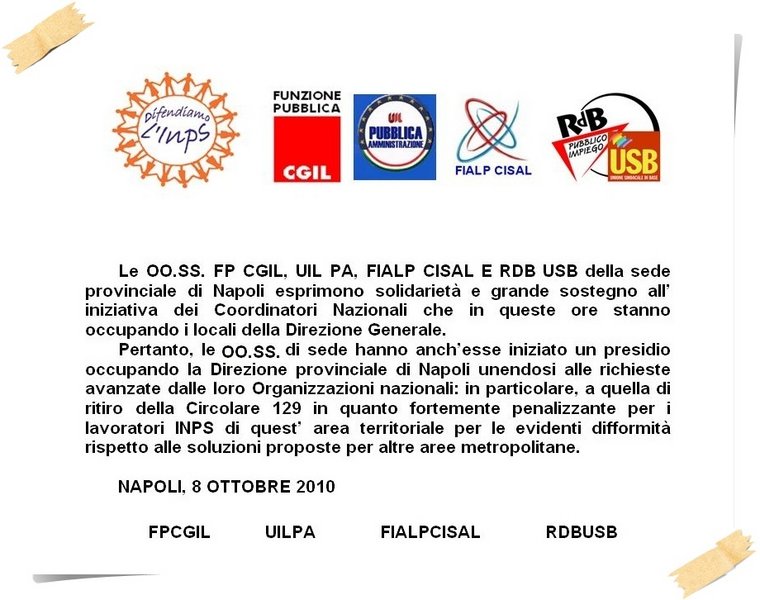 RdB/USB, FP CGIL, UIL PA e FIALP CISAL della sede provinciale INPS di Napoli esprimono solidarietà e grande sostegno all'iniziativa dei Coordinatori Nazionali che in queste ore stanno occupando i locali della Direzione generale.