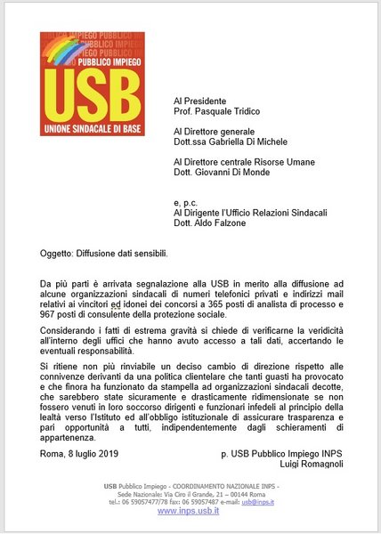 Da più parti è arrivata segnalazione alla USB in merito alla diffusione ad alcune organizzazioni sindacali di numeri telefonici privati e indirizzi mail relativi ai vincitori ed idonei dei concorsi a 365 posti di analista di processo e 967 posti di consulente della protezione sociale.